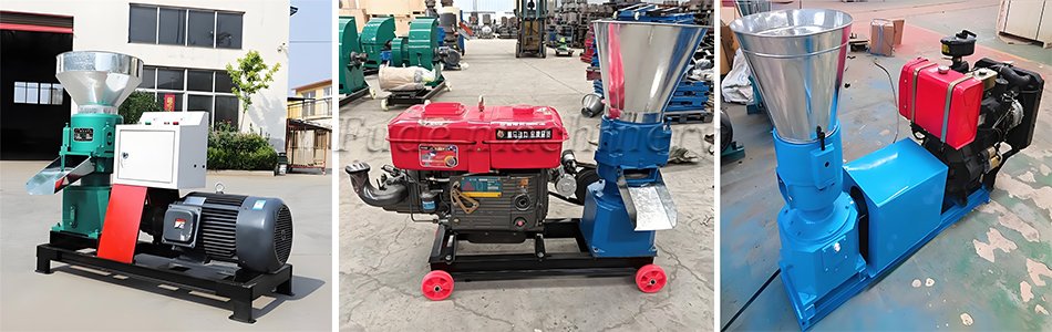 Flat die feed pellet mill is small scale feed pellet machine that is designed for small scale feed pellet production. Various power sources are available: electric motor, diesel engine, gasoline engine, you can choose according to your own needs.